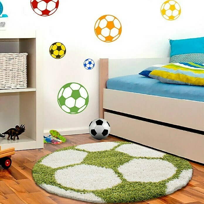 Der Hochflorteppich Fun ist Kinderzimmerteppich mit tollem Fußball-Design. Dieser attraktive Spielteppich ist optimal für das Kinderzimmer von heute geeignet. Das verspielte, kindgerechte Motiv und die dezenten Farben eignen sich ideal als Spieluntergrund und lassen Kinderaugen strahlen. Er bietet einen weichen Grundfläche, auf dem Kinder sichtbare Freude haben werden. Ein großer Vorteil ist auch das pflegeleichte Material und die robuste Qualität dieses Kinderteppichs. Gerade im Kinderzimmer sind diese Eigenschaften empfehlenswert. Er hält hoher Beanspruchung und Verschmutzungen stand, sodass Kinder lange Zeit Freude an dem neuen Bodenbelag haben.