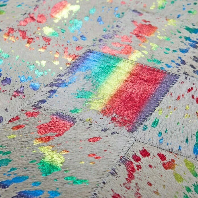 Der Kayoom Echtlederteppich Rocket ist ein in erlesener Handarbeit hergestellter Teppich on Patchwork-Optik. Die metallischen Applikationen auf echtem Leder mit weichem Haar zeichnen diesen besonderen Teppich aus. Die Basis des Lederteppichs bilden die verschiedenen Nuancen eines Farbtons. Die aufgedruckte, metallische Folie ist der besondere Clou und setzt schimmernd glänzende Akzente, die den Teppich erstrahlen lassen. Es gibt keine identischen Tierfelle. Ebenso ist jeder einzelne dieser Lederteppiche durch natürliche Abweichungen in Größe, Farbgebung, Muster und Struktur einzigartig. Die Unikate werden durch das Folien-Dekor in bunten Farben, Gold oder Silber abgerundet. Aus dem Naturmaterial Leder wurde in liebevoller Handarbeit ein hochwertiger Teppich hergestellt, der neben seiner Widerstandsfähigkeit und Robustheit auch dadurch glänzt, dass er lichtecht und einfach zu reinigen ist. Weicher Filz schließt die Unterseite des Lederteppichs ab und unterstützt sowohl Wärmeisolierung als auch Geräuschdämmung. Ebenfalls kann der moderne Designteppich in Räumen mit Fußbodenheizungen verwendet werden. In Kombination mit attraktiven Lederkissen, platziert auf Ihrer Couch oder dekorativ auf Stühlen, wird ein gelungenes Gesamtkonzept erschaffen. Das natürliche Fell kann nach einiger Zeit und bei hoher Beanspruchung gegebenenfalls Haare verlieren. Ebenso könnte sich der Foliendruck an einigen Stellen lösen. Dies basiert auf dem Naturprodukt und stellt kein Qualitätsmangel oder Produktionsfehler dar.