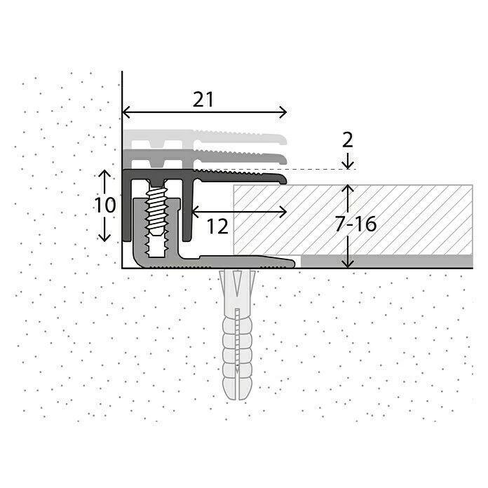 Das LOGOCLIC Abschlussprofil ist für die Verarbeitung von Laminat und Parkett mit Belagstärken von 7 – 16 mm geeignet. Das bewährte Schraubprofilsystem ist schnell und einfach zu verarbeiten. Zunächst wird das Basisprofil auf dem Untergrund verschraubt und der Boden verlegt. Danach wird das Oberprofil aufgelegt. Die beiden Stege greifen über den Schraubkanal des Basisprofils, mit den beigefügten Schrauben wird es im Schraubkanal befestigt.