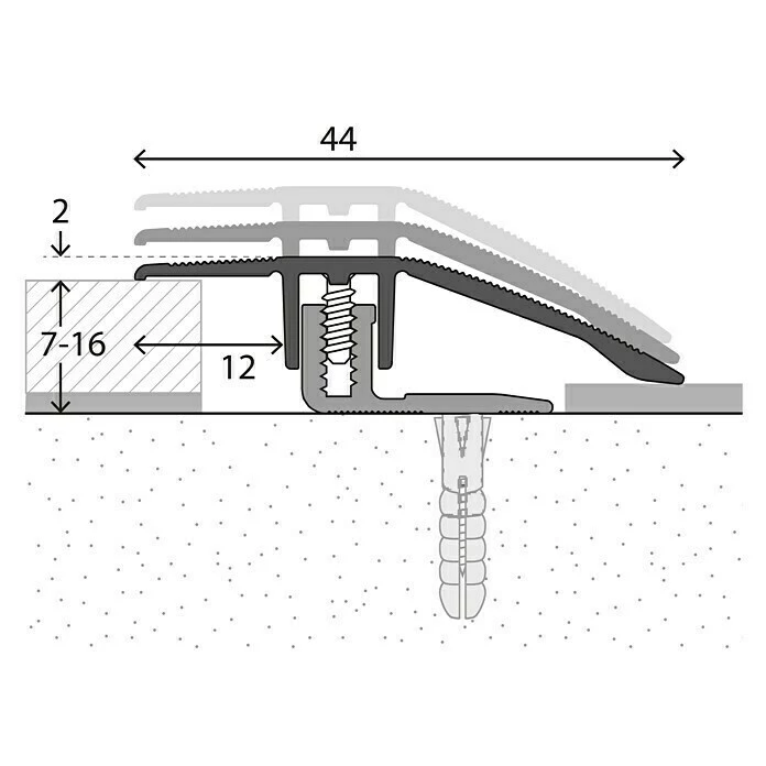 Das LOGOCLIC Anpassprofil ist für die Verarbeitung von Laminat und Parkett mit Belagstärken von 7 – 16 mm geeignet. Das bewährte Schraubprofilsystem ist schnell und einfach zu verarbeiten. Zunächst wird das Basisprofil auf dem Untergrund verschraubt und der Boden verlegt. Danach wird das Oberprofil aufgelegt. Die beiden Stege greifen über den Schraubkanal des Basisprofils, mit den beigefügten Schrauben wird es im Schraubkanal befestigt.
