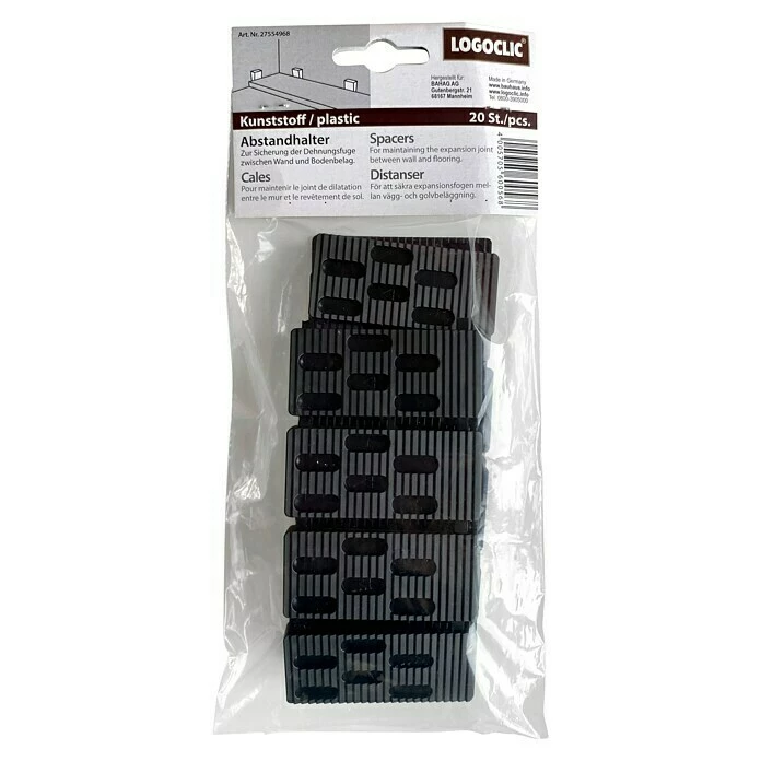 Die LOGOCLIC Abstandskeile sind aus äußerst robustem Kunststoff gefertigt und dienen der Fixierung von schwimmend verlegten Bodenbelägen. Um den erforderlichen Randabstand von ca. 12 – 15 mm zur Wand, zu Heizungsrohren, Pfeilern, Türstoppern etc. zu gewährleisten, sind die mit einer Zahnung versehenen Kunststoffkeile unerlässlich. Nach der Verlegung müssen diese wieder entfernt werden.