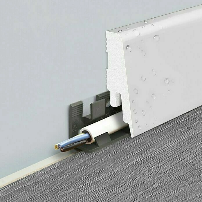 Diese Sockelleiste können Sie mithilfe von Leistenclips einfach und schnell befestigen. Insbesondere für Mietwohnung ist diese Variante der Befestigung sehr beliebt, da eine Demontage unkompliziert durchgeführt werden kann. Pro Leiste werden in etwa 4 – 6 Clips benötigt. In einem Abstand von ca. 40 bis 60 cm werden die Clips mit Dübeln und Schrauben an der Wand befestigt. Im Anschluss muss die Sockelleiste nur noch von oben auf den Clip gesteckt werden. Alternativ kann die Sockelleiste mit Kleber, Nägeln oder Schrauben an der Wand befestigt werden.