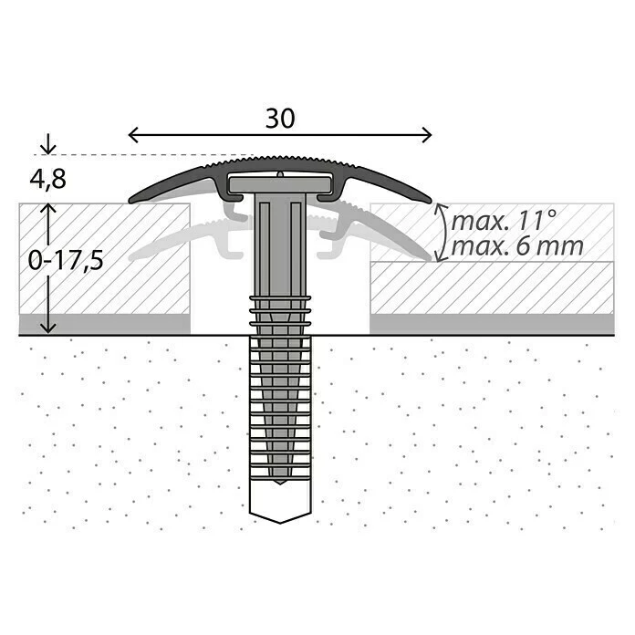 Das LOGOCLIC Übergangsprofil wird mit Nylon-Lamellendübeln verdeckt befestigt. Ins Bohrloch eingetrieben, krallen sich die Lamellen an der Bohrlochwand fest und sorgen für dauerhaften Halt. Zugleich bewirkt die Elastizität des Dübels, dass sich das Profil in Höhe und Neigung dem Bodenbelag und Niveauunterschieden anpassen kann. Im Gegensatz zu Profilen mit vorgegebenen Bohrlöchern können die Bohrlöcher dort gesetzt werden, wo die Haltekräfte benötigt werden, z.B. in Laufstraßen. Da das Profil ohne Basisprofil verarbeitet wird, ist es die ideale Lösung, um Dehnungsfugen im Bodenbelag nachträglich zu schließen.