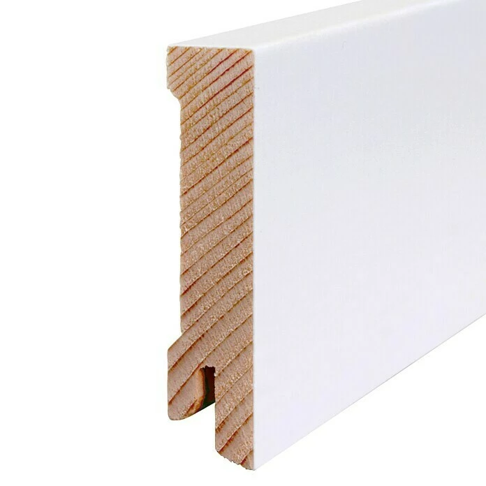Die Sockelleiste aus einem hochwertigen Fichtenholzkern ist von einer Starkfolie in klarem, reinem Weiß ummantelt. Das Ergebnis ist eine besonders robuste, langlebige Leiste, die mit einem schlichten, puristischen Look punktet. Dieser wird durch ihr modernes, eckiges Profil noch verstärkt, da dieses zu vielerlei Einrichtungsstilen passt. Einen praktischen Vorteil bietet die Clip-Nut der Sockelleiste. Damit ist eine einfache und verdeckte Montage möglich.